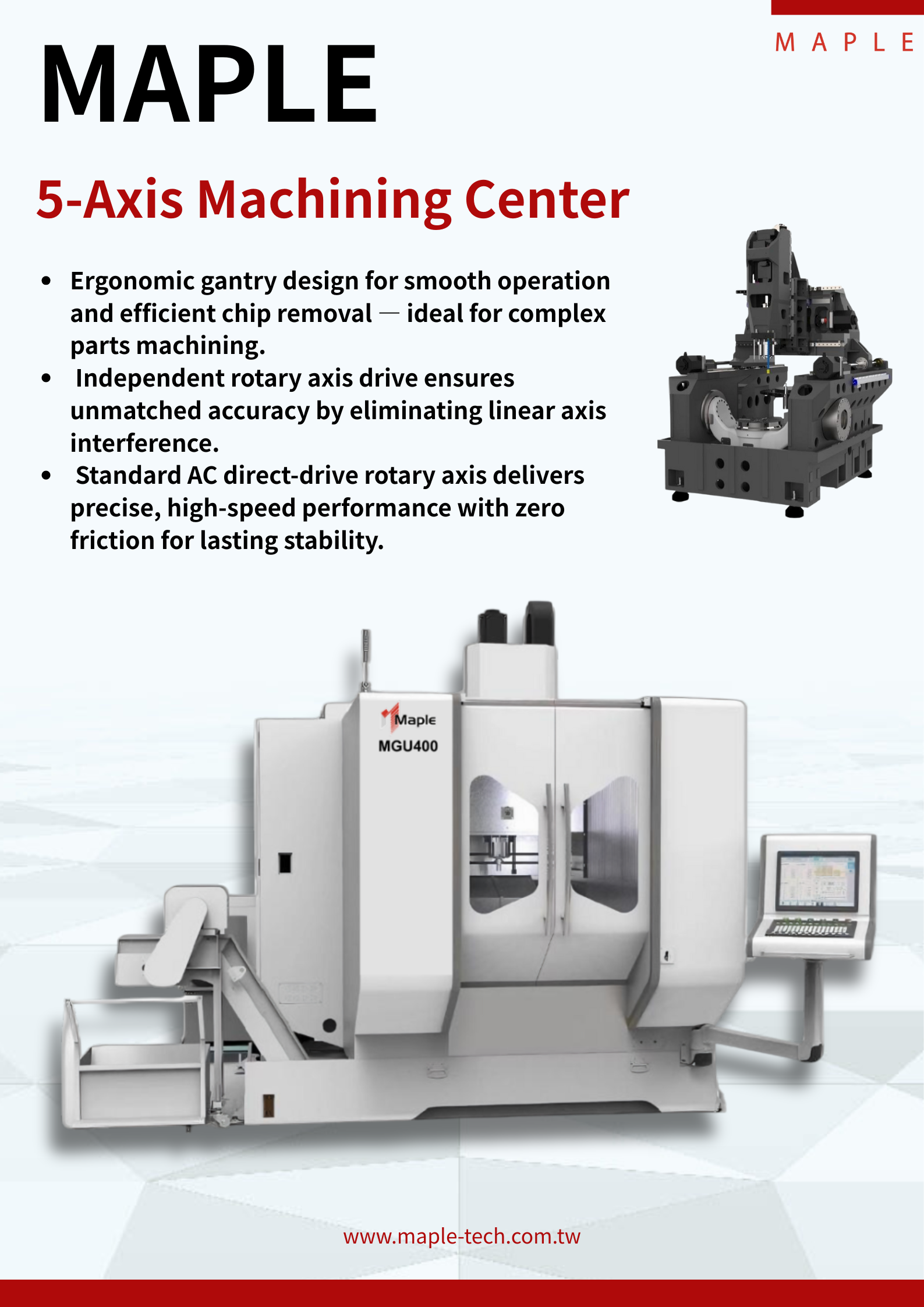 The MGU Series from Maple Technology is a high-performance gantry-type 5-axis machining center designed to meet the demands of modern manufacturing — where part complexity, dimensional accuracy, and operational efficiency are critical.
